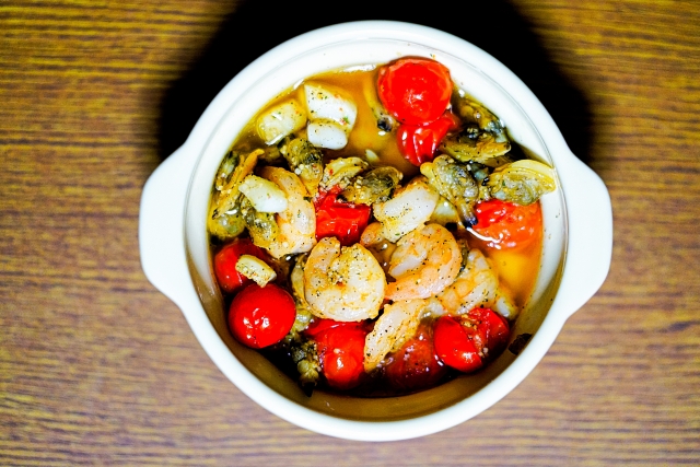 - コウイカ・アサリ・トマトを入れて火が通ったら塩で味を整える